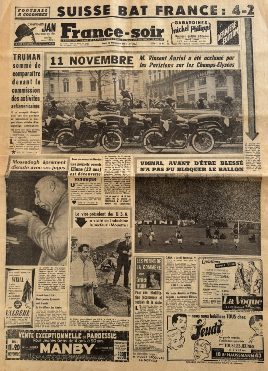 France Soir 11/11/1953 Vincent Auriol a été acclamé sur les Champs-Élysées - Armistice du 11 novembre 1918