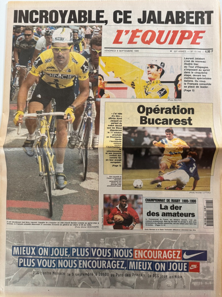 Journal l'équipe 08/09/1995 Incroyable Laurent Jalabert - Tour d'Espagne - Cyclisme
