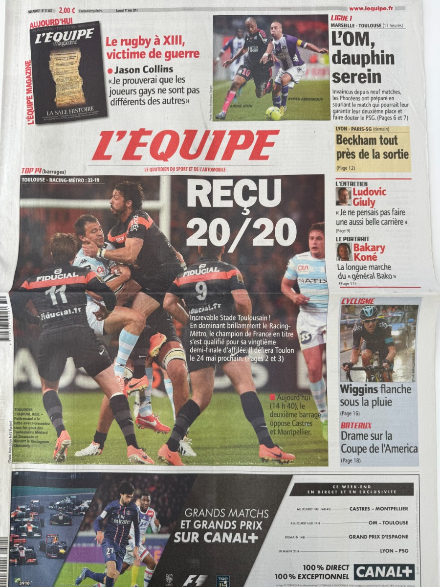 Journal l'équipe 11/05/2013 Toulouse / Racing Métro - reçu 20 / 20 - Rugby