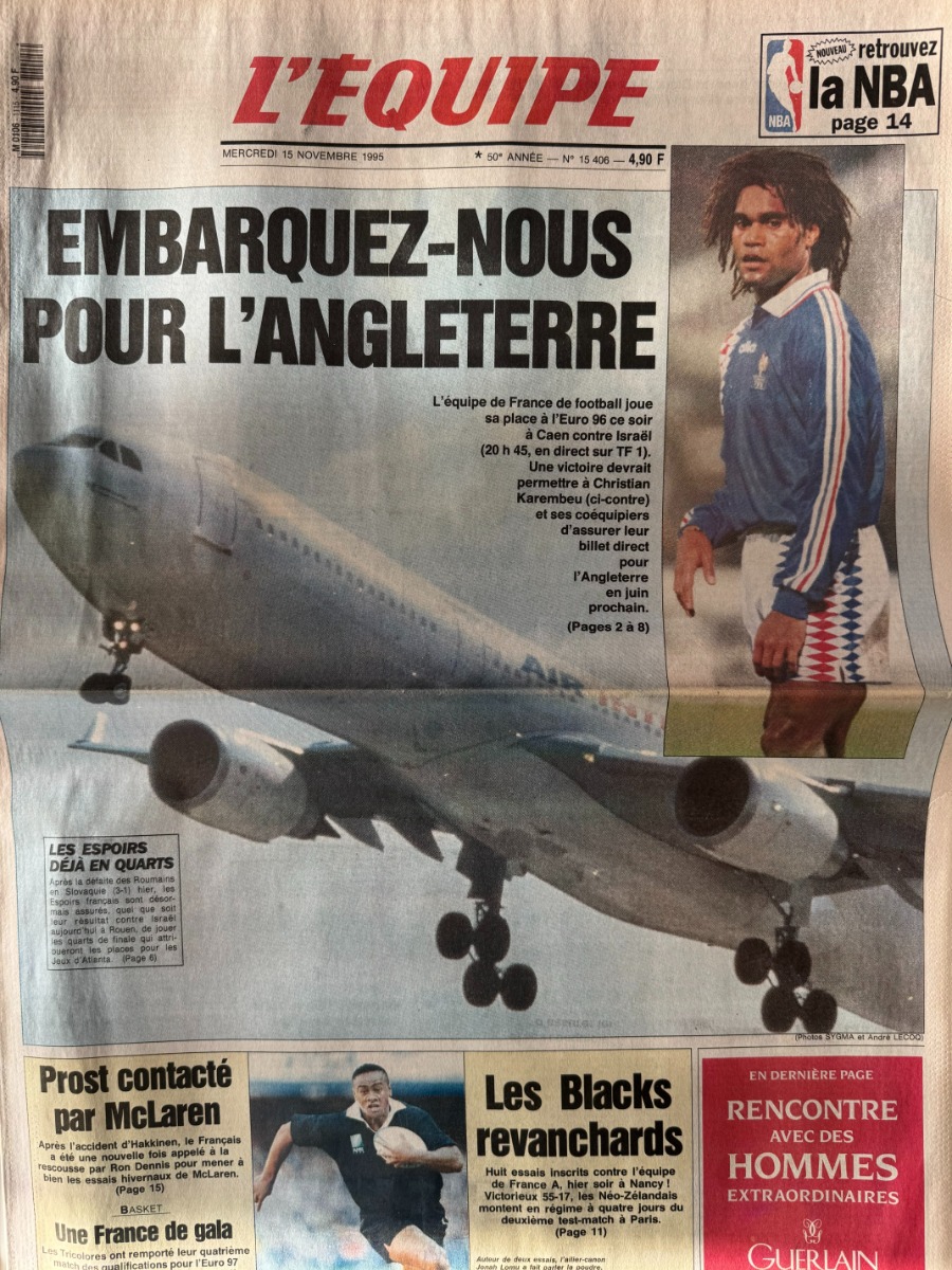 Journal l'équipe 15/11/1995 Israël / France qualification pour l'Euro 96 - Football