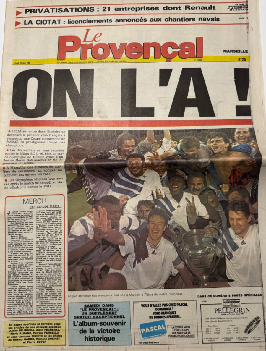 Le Provençal 27/05/1993 On L'A !! - Finale Marseille / Milan AC - Coupe d'Europe de Football